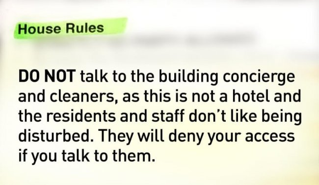 "DO NOT talk to the building concierge," read the document. "They will deny you access if you talk to them.… Non-compliance of the house rules … will result in a minimum $200 charge."
