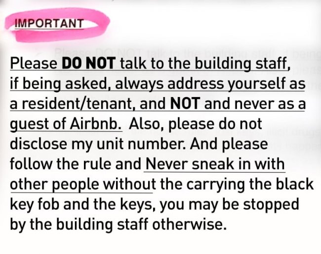 "If anyone asks, you're just visiting," the rules read. "Please don't mention Airbnb or short-term rental. It's prohibited in the condominium building."